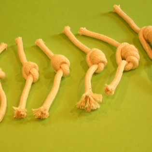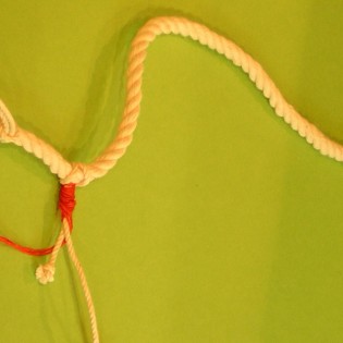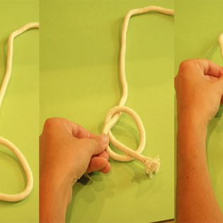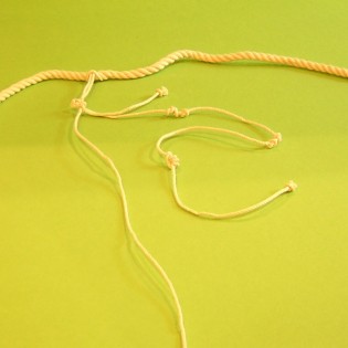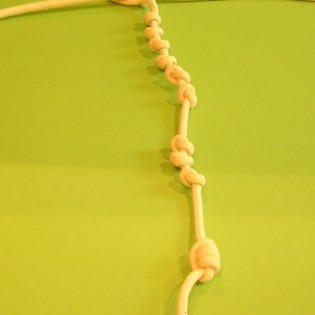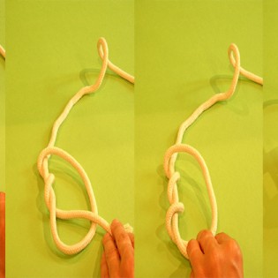 Nudo largo: Toma la cuerda de algodón de 0.5 centímetros de grosor y haz un nudo largo siguiendo los pasos de las fotografías. Los nudos largos parten como nudos simples. Luego se envuelve la cuerda con el extremo libre como indica la fotografía. Es importante que al final tires la cuerda hacia arriba para apretar el nudo, como muestra la última foto de esta sección.