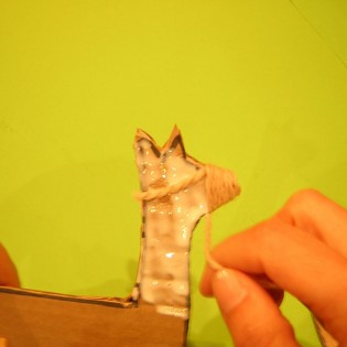 Desarma los perros de la ropa para usarlos como patas de la llama. Pon cola fría en las marcas de las patas del cartón, y pega los perritos. Pon atención a la manera en que se ponen los perros para que la llama quede estable. Espera un rato para que la cola fría se seque y las patas queden bien pegadas. Para la llama y prueba su estabilidad. Si se cae es porque pegaste los perritos al revés. Hazlo de nuevo.