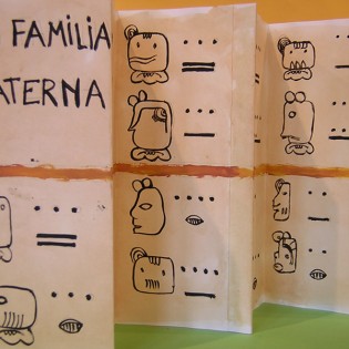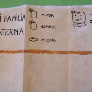 En la primera sección pusimos el título. En la segunda pusimos los símbolos que usaremos para mujer, hombre, y para los muertos. En la tercera sección superior del códice partimos por los décimos antepasados (la bisabuela y el bisabuelo de los bisabuelos de los bisabuelos de los niños) con las edades que tenían cuando murieron (70 la mujer y 65 el hombre). Luego en cada sección siguiente pusimos a la pareja de antepasado del niño, con sus edades, terminando con tres glifos en la parte inferior derecha. Ellos representan a los hermanos, con sus respectivas edades.