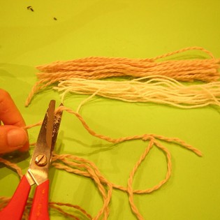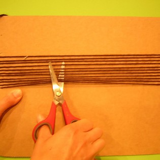 Saca el tejido del cartón y amarra las lanas sueltas una con otra. Corta los pedazos de lana dejando unos tres centímetros sueltos.