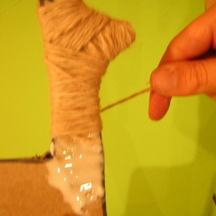 Toma uno de los ovillos de lana y amarra su punta al cartón como muestran las fotos.