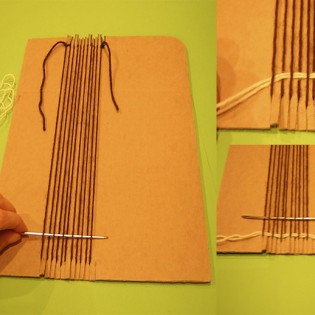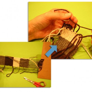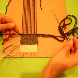 Enhebra con la aguja un trozo de lana de un metro de largo aproximadamente (si la lana es muy delgada, ponla doble, es decir, usa dos metros). Comienza a tejer la urdimbre por el lado del cartón que no tiene los nudos. Pasa la aguja una vez por arriba de la lana de la urdimbre y la siguiente por abajo hasta terminar la fila. Devuélvete fijándote que si terminaste por abajo la última lana de la urdimbre, debes comenzar por arriba y avanzar alternadamente, por arriba y por abajo. Repite esto varias veces, y cuando quede poca lana termina en un extremo de la urdimbre y deja unos diez centímetros de lana suelta.