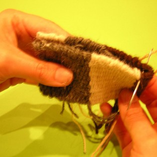 Pega con cola fría los pedazos de lanas sueltas al tejido, en ambos lados. Dobla el tejido por la mitad, dejando las lanas pegadas hacia adentro, y cose ambos costados con otra lana.