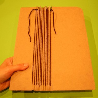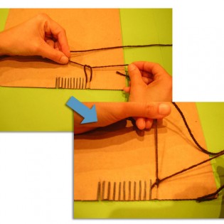 Pasa la lana de un extremo al otro del cartón, como muestra la foto. Fíjate que las lanas queden paralelas y que termines en el mismo lado en que empezaste. Asegura la lana con un nudo igual al del comienzo y córtala. A esta base del tejido se le llama urdimbre. Sobre ella harás ahora la trama.