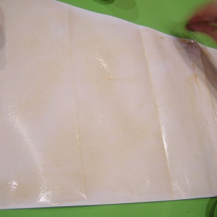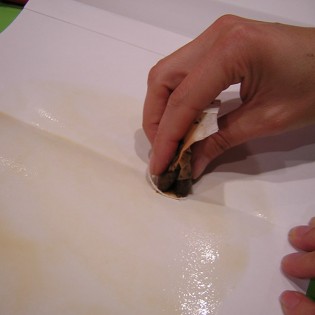 Llena un vaso con agua caliente de la llave. Mete la bolsita de té en el agua, estrújala y pásala por ambos lados de la hoja. Verás que la hoja toma color de códice maya. Déjalo secar.