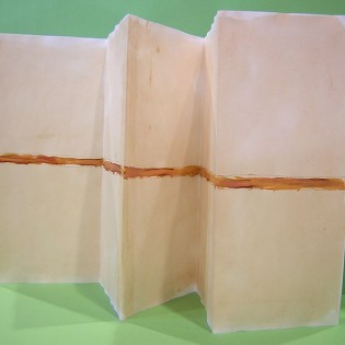 Pinta con témpera café rojizo una línea a lo largo del códice, dividiendo las páginas en dos partes iguales. Repite esto por el otro lado.