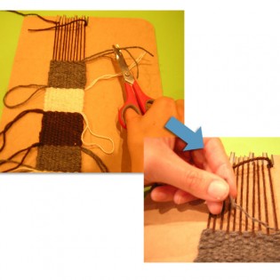 Para rematar el tejido, separa las hebras de la lana en dos y teje con una de ellas, pasando por arriba y por abajo las lanas de la urdimbre, igual que antes. Corta el pedazo que sobra, y también corta la hebra que no tejiste.
