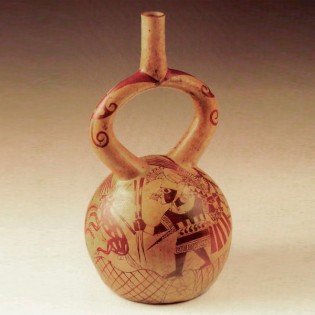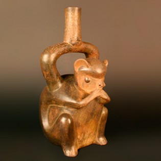 Los monos han sido uno de los animales selváticos más representados en el arte Moche, Vicús y Chimú, todas culturas del norte de Perú. Entre ellos se reconoce al mono araña y al aullador, que se caracterizan por sus grandes ojos y larga cola prensil. Estos animales vivían en la selva, pero fueron llevados a la costa como mascotas. Al parecer, ocuparon un lugar importante en las creencias sobre la vida y la muerte, ya que son motivo frecuente en la cerámica funeraria. El mono también aparece con rasgos humanos en batallas rituales, representando posiblemente a algunos ancestros míticos de los hombres.