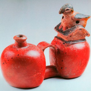 Los músicos y artesanos de la cultura Chorrera de Ecuador, inventaron las “botellas silbatos”, que son vasijas de cerámica con un complicado sistema de sonido. La pieza de la fotografía es una botella doble. Sus dos cuerpos están conectados por un delgado conducto y unidos por un asa, llamada por su forma, “asa puente”. Para que suene el instrumento, hay que echarle agua e inclinarlo, entonces la presión del agua hace sonar un silbato muy agudo, penetrante y continuo, reproduciendo de esta forma los trinos y gorjeos del ave representada sobre el techo de la casa. Cuando varios jarros se tocan juntos se produce una combinación de sonidos armónicos, que crean melodías fantasmas ¡que nadie está tocando! Se cree que estos jarros eran utilizados para rituales y ceremonias y que su sonido inducía a los participantes a alcanzar un estado de trance.