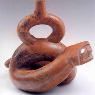 La serpiente se ha representado en el arte prehispánico de muchas formas, a través de todos los períodos culturales. Junto al cóndor y el felino, ha sido uno de los animales más importantes de la cosmovisión andina. Una leyenda andina relata la existencia de dos serpientes que viven bajo la tierra o Urkupacha, cuando éstas emergen a la superficie o Kay Pacha, se convierten, la primera en un inmenso río o Yacu Mama, y la segunda en un gigantesco árbol o Sacha Mama. Al ascender al cielo, Yacu Mama se transforma en el rayo y Sacha Mama en el arco iris. Ambas se relacionan con la fertilidad y la lluvia y son objetos de culto en los pueblos andinos. Esta pieza de la cultura Moche representa una serpiente con rasgos de felino, con su boca con dientes, grandes colmillos y bigotes.