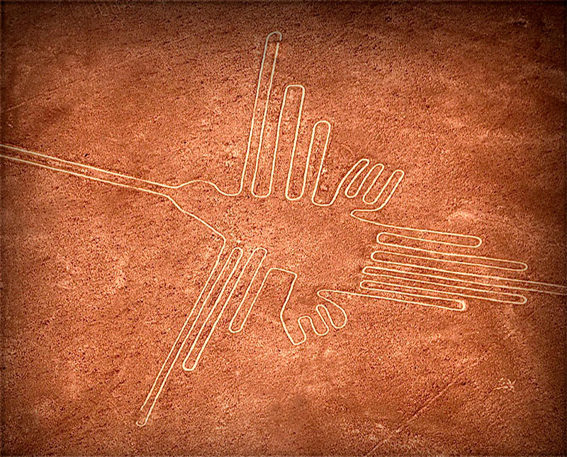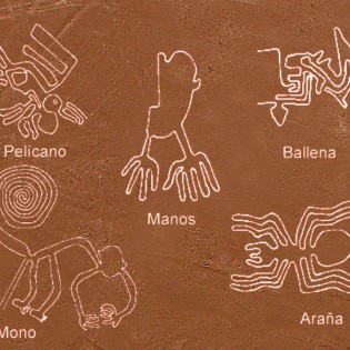 Las líneas de Nazca son un gigantesco conjunto de geoglifos dibujados en el suelo de las pampas del desierto de la costa sur de Perú. La mayoría está formada por figuras geométricas, especialmente líneas rectas, algunas de varios kilómetros de largo. Otras tienen formas de trapecios, círculos y líneas en zigzag. Un número menor representan inmensas figuras con formas de animales: el mono, el colibrí, el lagarto, la orca. Para realizar los geoglifos se retiraron las piedras oscuras que cubren el suelo, dejando a la vista el terreno natural que es de color claro.