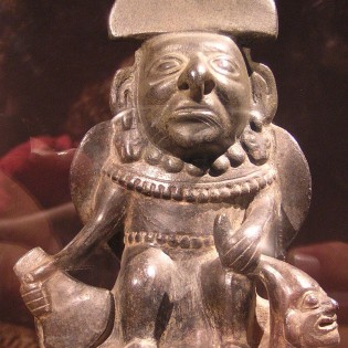 Uno de los temas más frecuentes en el arte prehispánico andino es un personaje que lleva un hacha en una mano y una cabeza humana en la otra. Muchos arqueólogos piensan que se trata de un ser mítico, no de un personaje real. Mito o realidad, la verdad es que se han encontrado cuerpos sin cabeza y cabezas sin cuerpos en los cementerios de casi todas las culturas andinas. Las cabezas tienen una cuerda para transportarlas y la mayoría son de hombres adultos, lo que sugiere que pertenecieron a guerreros y que fueron conservadas como trofeos de combate. Las cabezas cortadas también se relacionan con ritos de fertilidad de la tierra. En algunos dibujos de la cultura Nasca, se han representado cabezas humanas, de las cuales salen plantas, como si fueran semillas que germinan. En la fotografía de esta pieza de la cultura Moche se ve a un hombre con una cabeza cortada en la mano izquierda y un hacha en la derecha.