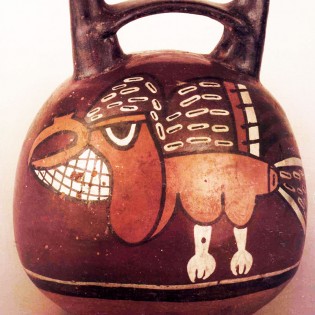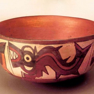Las representaciones de las criaturas fantásticas Nasca fueron cambiando a través del tiempo. Así, la orca que en un comienzo se reconocía fácilmente, como muestra la pieza de la fotografía, fue evolucionando hasta terminar en una figura muy abstracta y poco reconocible, como se aprecia en esta pieza.