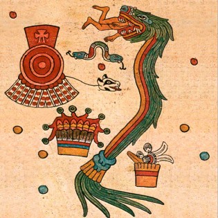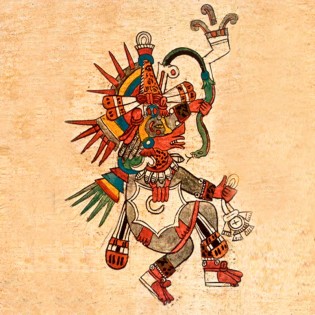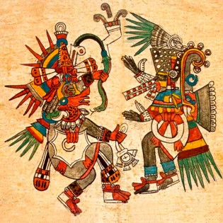 Quetzalcóatl, dios de la naturaleza, fue adorado por los aztecas y estaba relacionado con la estrella de la mañana (Venus), el viento (Ehécatl) y el sol (Nanahuatzín). Para los aztecas representaba a un rey-sacerdote mitológico creador de la escritura, el calendario y el arte. La historia mitológica azteca cuenta que Quetzalcóatl, el antiguo rey sabio, no aceptó nunca los sacrificios humanos. Al parecer trató de prohibir estas prácticas pero fue vencido por su enemigo, el dios Tezcatlipoca. Debido a su derrota abandonó la ciudad y se dirigió a la costa, donde se lanzó a una hoguera y se transformó en el lucero del alba (Venus). Otras versiones de esta historia cuentan que se alejó por el mar prometiendo volver algún día. Esta fue la razón por la que los aztecas creyeron, al ver a los españoles llegar desde el mar, que era Quetzalcóatl que volvía.