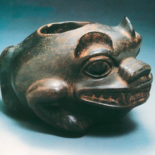 Este recipiente Chavín para ceremonias religiosas representa dos animales: una rana y un felino. Se cree que este recipiente fue usado en ritos donde se pedía lluvia, ya que la rana significaba para los antiguos andinos fertilidad y humedad. Sus atributos felinos le darían el carácter de animal divino o fantástico.