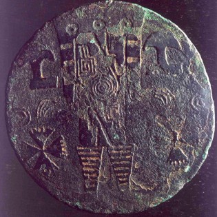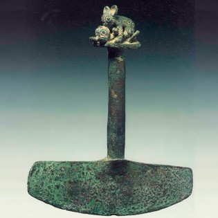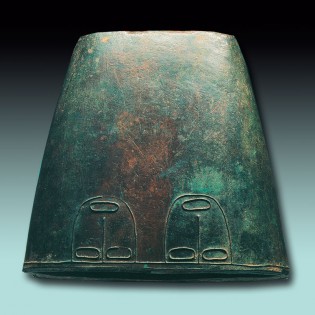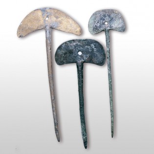 El disco de la fotografía es de bronce estañífero (cobre con estaño) y está decorado con un personaje que tiene un tumi a cada lado.