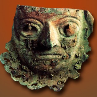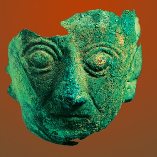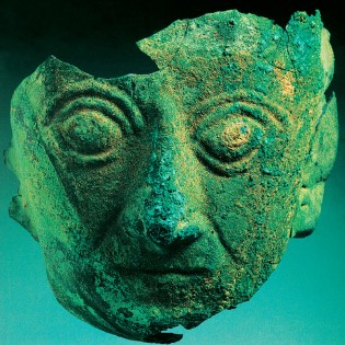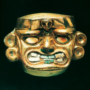 En la cultura moche, de la costa norte del actual Perú, (100-800d.C.) se enterraba a los grandes señores con ricas máscaras de cobre, a las que habitualmente ponían narigueras, tocados de plumas de colores y conchas blancas en los ojos. A través de estas máscaras se pretendía conservar la imagen del rostro del muerto, para que éste siguiera viviendo en la muerte. Además, las máscaras daban un aspecto impresionante al difunto, quien estaba acompañado de un rico ajuar funerario de piezas metálicas. La máscara de la foto, que ahora se ve de color verde, probablemente era de color rojizo cuando fue puesta sobre el rostro del muerto, debido a que al oxidarse, el cobre se pone verde. Es posible que esta máscara tuviera adornos, como conchas y aros, que se extraviaron.