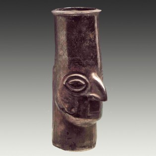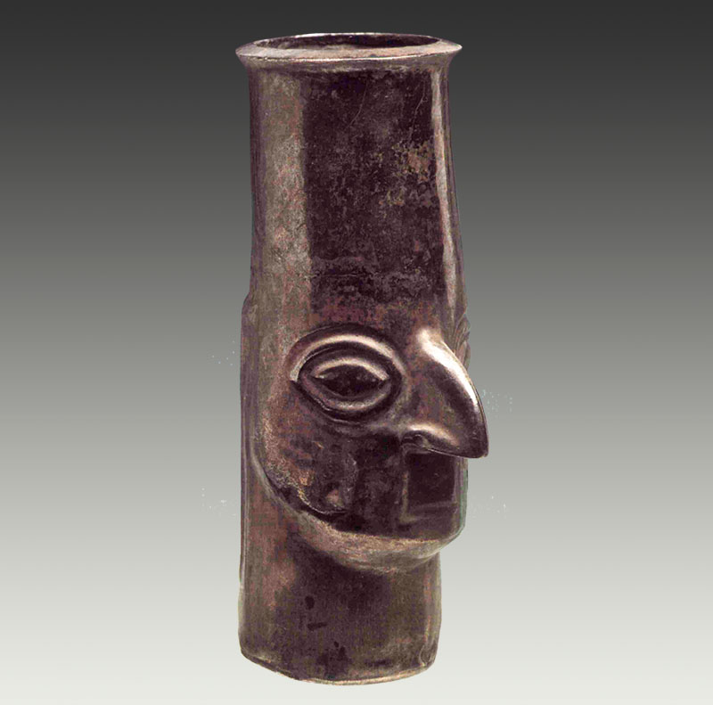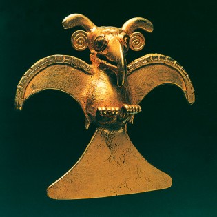 Uno de los centros precolombinos que alcanzó mayor desarrollo en sus expresiones estéticas fue Veraguas, (1400–1500 d.C.) en Panamá. Dentro de la metalurgia se destacan las técnicas para el trabajo del oro. Son muy comunes las representaciones de garzas, monos, tortugas, ciervos, murciélagos, cangrejos, tiburones, sapos, lagartos, serpientes, pez raya y jaguar. Esta pieza es de oro y muestra a un guacamayo en actitud de vuelo. Los espirales que tiene a la altura de las orejas se han encontrado en muchas piezas de pájaros, por lo que se supone hay una relación entre este motivo y el vuelo de las aves.