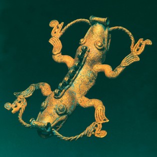 La metalurgia de la región de Diquís, (900-1.550 d.C.) en el litoral pacífico de Costa Rica, produjo cientos de joyas: pendientes, diademas, collares, máscaras y adornos para ser aplicados sobre la vestimenta. Los arqueólogos creen que las figuras de oro del período Diquis tardío representan animales especialmente seleccionados por sus conductas predatorias. Es el caso del lagarto, un habitante de los ríos, un cazador implacable. Este lagarto bicéfalo aparece marcado por la ferocidad y es representado con una serpiente atrapada entre sus fauces. Esta pieza, que puede estar relacionada al tránsito entre la vida y la muerte, está hecha de cobre y oro, es decir, tumbaga.