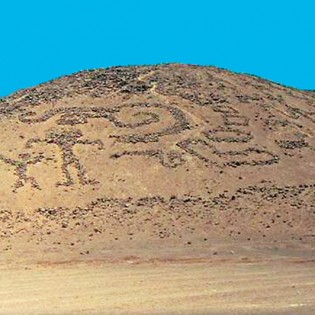 Los geoglifos son grandes figuras dibujadas sobre el suelo y en laderas de cerros. Se construyen acumulando piedras más claras o más oscuras que la superficie del suelo, o sacando las piedras, que por contraste con el color del suelo, forman las líneas de la figura.