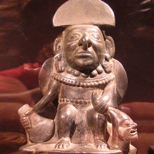 En las ciudades mexicanas de Teotihuacán y Monte Albán se rendía culto a Xipe Totec, “nuestro señor el desollado”, dios de la primavera, la fecundidad y la perpetua renovación de la tierra. A veces, se lo representaba vestido con una piel humana, como un símbolo de la renovación de la naturaleza. Era además una divinidad protectora de los orfebres y dios de los guerreros sacrificados. En otras ocasiones, se lo esculpía bajo una piel de jaguar, de serpiente o de mono. La escultura tolteca que vemos en la fotografía muestra a Xipe Totec cubierto con una piel de mono.