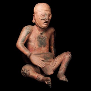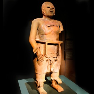 Este personaje -hecho en cerámica- de la cultura Veracruz (300-900 d.C) es un jugador de pelota. Se encuentra en posición de descanso y en la cabeza lleva un casco, en su rostro tiene antiparras, en las piernas tobilleras y rodilleras con el rostro de un dios. También lleva un complicado cinturón o yugo para protegerse del golpe y empujar la pelota con las caderas.
