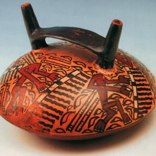 Uno de los temas más frecuentes en el arte prehispánico andino es un personaje que lleva un hacha en una mano y una cabeza humana en la otra. Muchos arqueólogos piensan que se trata de un ser mítico, no de un personaje real. Mito o realidad, la verdad es que se han encontrado cuerpos sin cabeza y cabezas sin cuerpos en los cementerios de casi todas las culturas andinas. Las cabezas tienen una cuerda para transportarlas y la mayoría son de hombres adultos, lo que sugiere que pertenecieron a guerreros y que fueron conservadas como trofeos de combate. Las cabezas cortadas también se relacionan con ritos de fertilidad de la tierra. En algunos dibujos de la cultura Nasca, se han representado cabezas humanas, de las cuales salen plantas, como si fueran semillas que germinan. En la fotografía de esta pieza de la cultura Moche se ve a un hombre con una cabeza cortada en la mano izquierda y un hacha en la derecha.